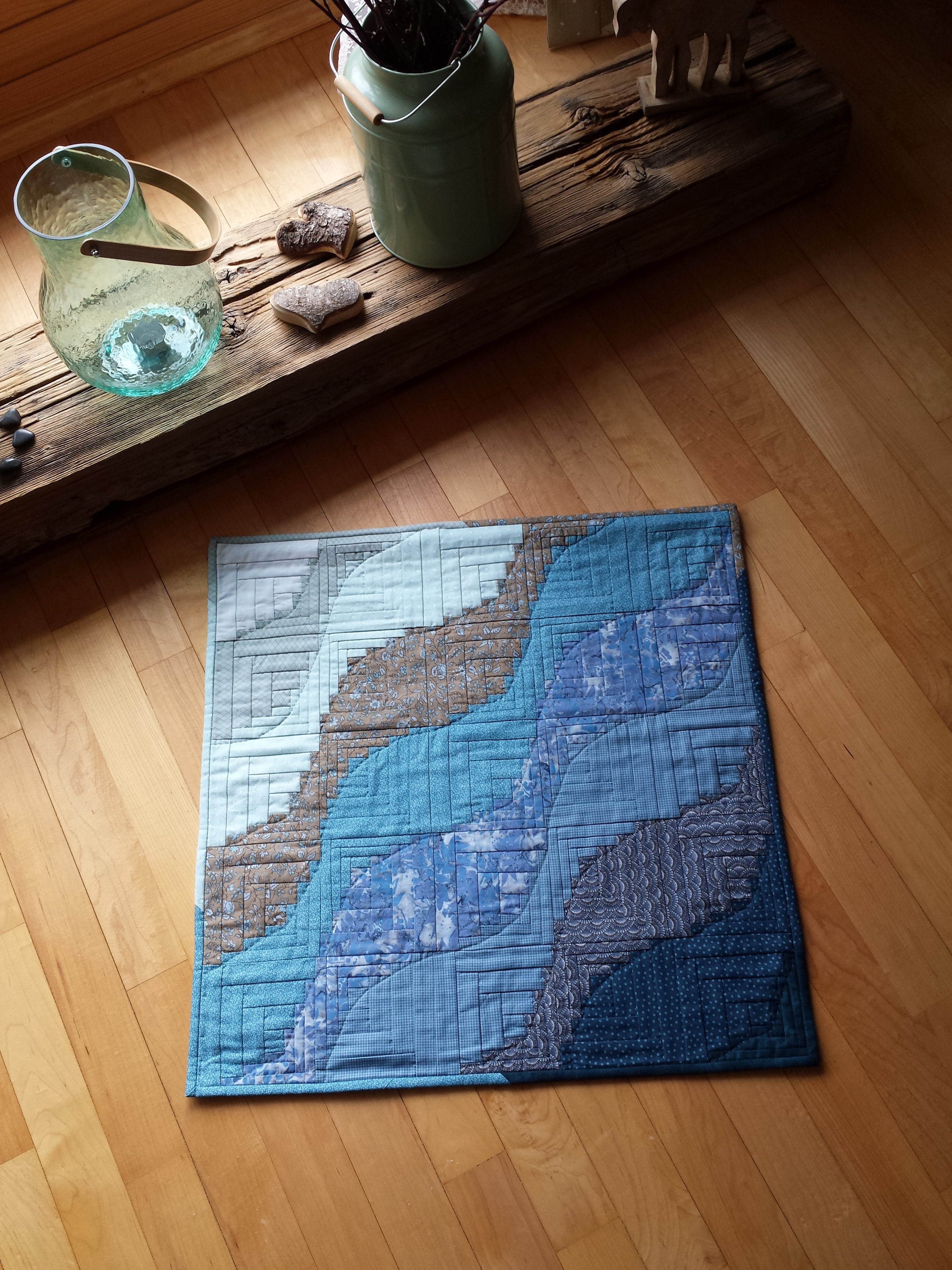 Hallöchen!!! Heute möchte euch den kleinen Quilt zeigen, der Kursinhalt in Österreich ist: das Teilchen ist als Wandbehang gedacht,65×65 cm groß und beinhaltet so ziemlich alle Techniken, die Frau/Mann so braucht. Er ist aus 5×5 Log Cabins ( das ist einer der ältesten Patchworkblöcke ) genäht und beinhaltet das Schneiden mit Rollschneider, Lineal und Schneidematte, das Zusammennähen der Streifen ( patchen ), das Heften der 3 benötigten Stofflagen, das Handquilten in einem überschaubarem Umfang und die Anbringung des Randstreifens mit Aufhängetunnel.
