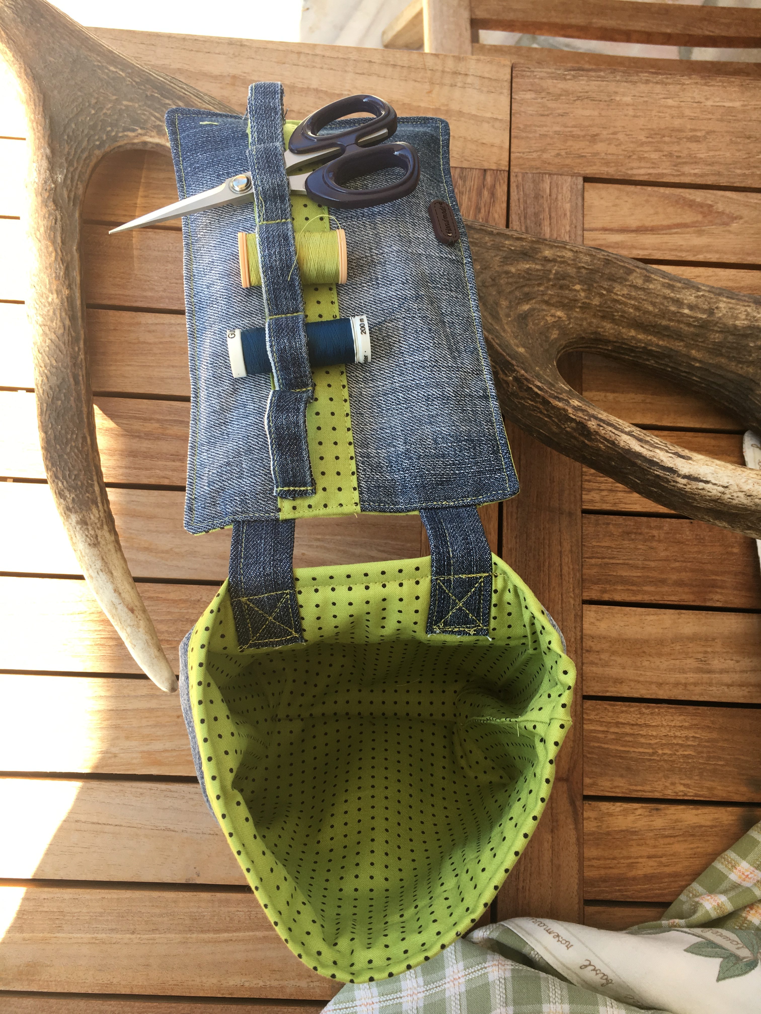 Das hat mich ja schon immer super gefuchst! Die Nähmaschine ist auf dem Tisch und genauso viele Fäden, Schnipsel und sonstwas alles. Dann müssen immer die Plastikdosen, Teller und Plastikbeutel her. Damit ist jetzt Schluß: aus ein paar übriggebliebenen Jeansresten hab ich mir ein Beutelchen für den Platz neben der Nähmaschine genäht. Und damit der nicht runterfällt oben dran eine Platte mit Reis gefüllt ( natürlich auch aus Stoff ) mit ein bisschen Schnickschnack! So, wie ich es liebe halt!