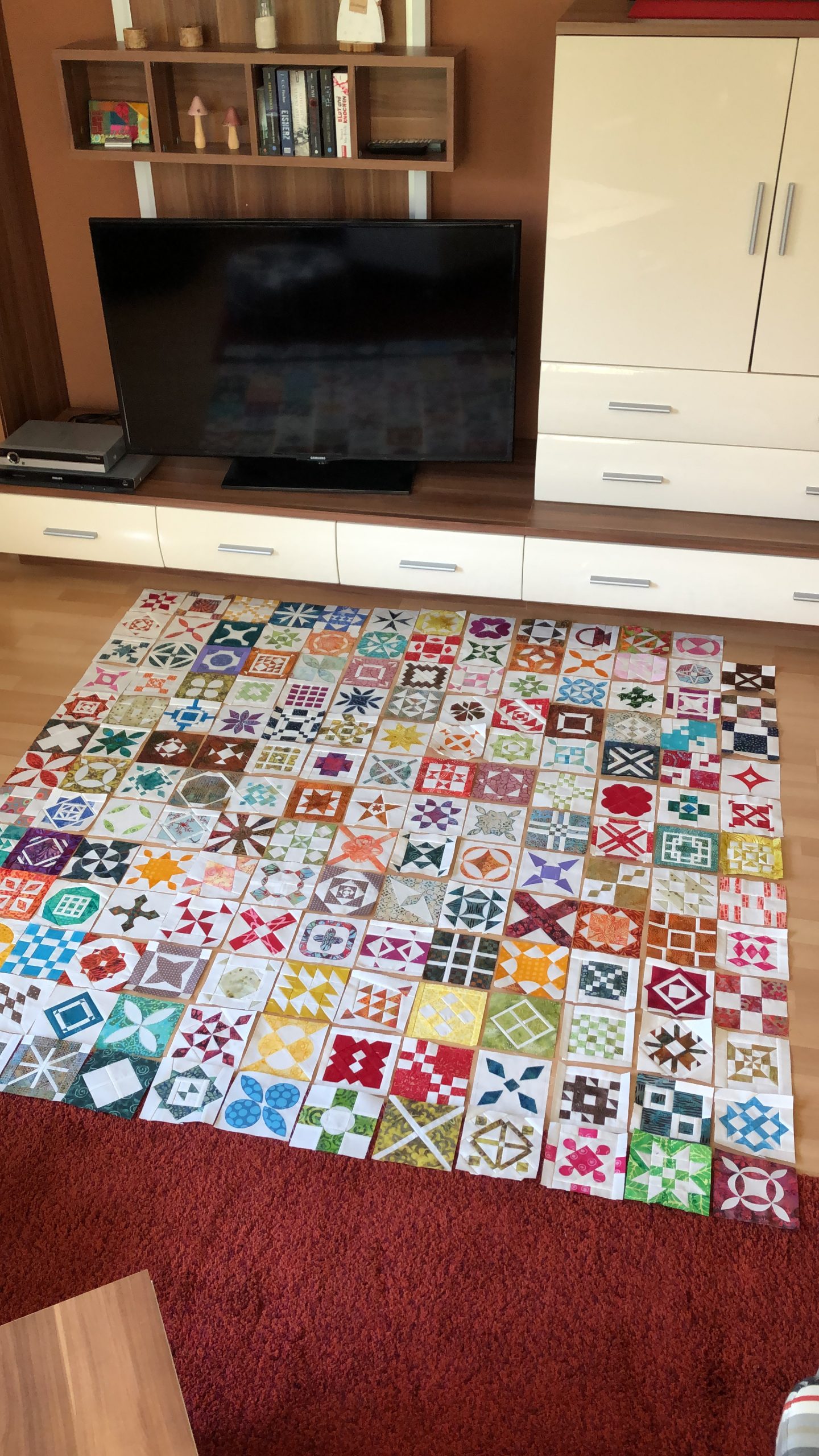 Trotzdem sind all meine 169 kleinen Blöcke für den „Baby-Jane“ – Quilt fertig 🎉💃🏻🥳. Im Herbst kommt dann das Zusammensetzen dran. Leider reicht mein heller Hintergrundstoff nicht mehr für die Stege und wenn jemand einen Tipp für mich hat, wo ich den Makower Tiny Dots mw0859, bisquit s 4, noch beziehen könnte? Schön wärs und ich würd auf dem Tisch tanzen😃💃🏻.