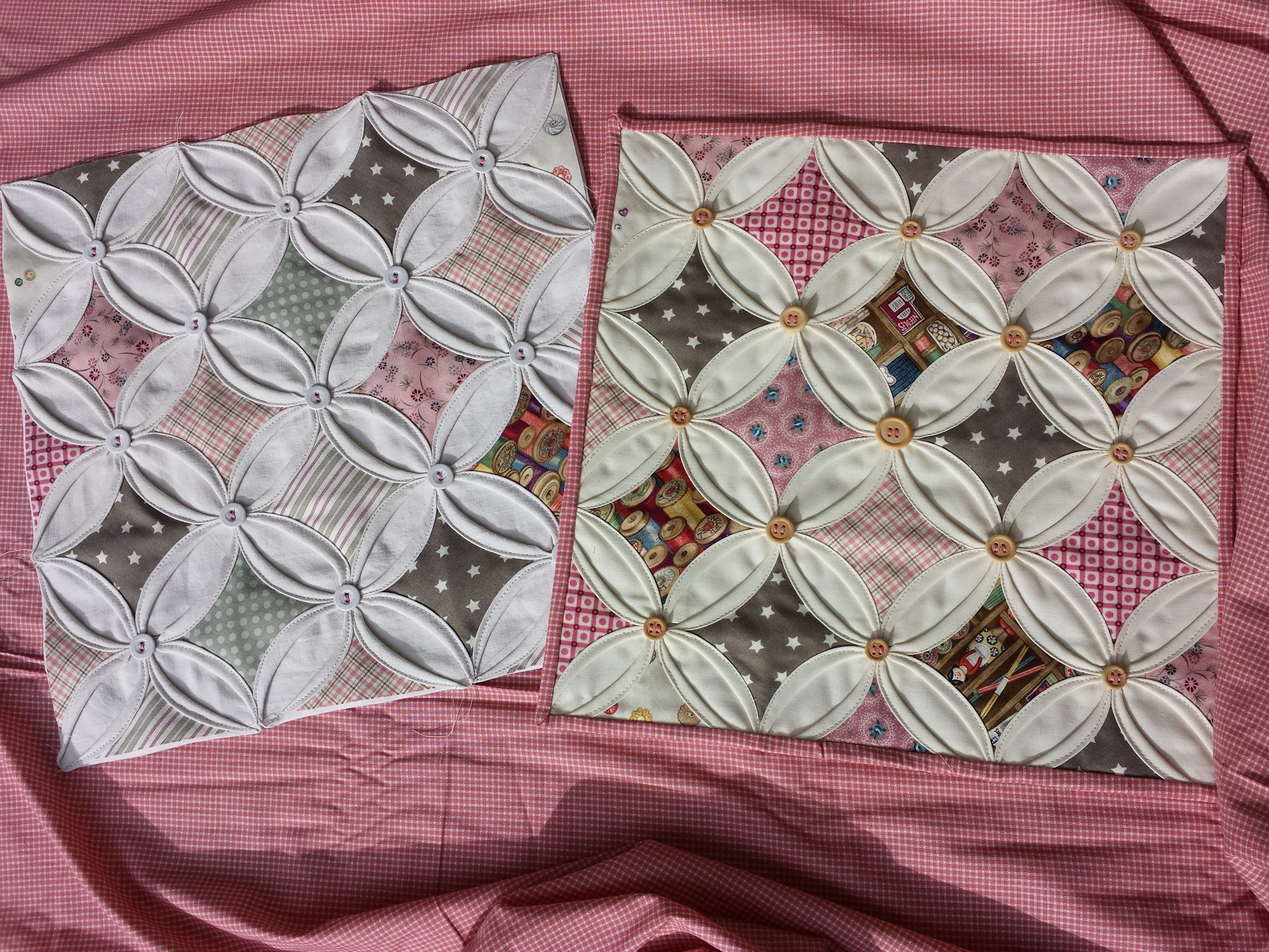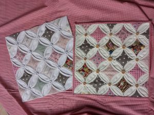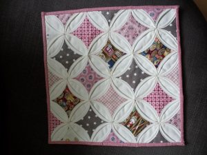 Jetzt aber hab ich mich mal an diese hübschen Kirchenfenster gemacht. Das beste Tutorial hab ich bei YouTube auf der Seite „Shabby fabrics“ gefunden. Ich habe dann auch gleich in Inch genäht, was ich ja selten tue, hab aber sogar ein Inchfüßchen bei meiner Maschine gefunden. Das ist dann eine ungefähre Nahtzugabe von 6mm, d.h. 1/4 inch.