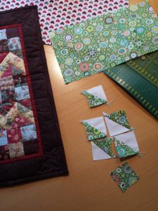 Ein bißchen kniffelig war nur, das Maaß für die Quadrate, die zu Dreiecken geschnitten werden, auszutesten. Denn die sind ja größer als die verwendeten 5 cm Quadrate. Bei meinem ersten Bild seht ihr meine Versuche mit dem grünen Kafee Fasset- Stoff, erst hab ichs mit 6 cm, dann mit 6,5 cm versucht und dann bin ich bei, ja ratet mal: 6,25 cm gelandet. Es gibt einen Trick, indem man 2 Quadrate aufeinanderlegt, zusammennäht und dann schneidet. Dann hat man “ ruckzuck “ sein gewünschtes Quadrat bestehend aus 2 Dreiecken.