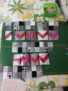 Wer Bedarf hat, dem erklär ichs genauer. Es ist mir aber auch immer wieder aufgefallen, wie empfindlich Dreiecke in der Verarbeitung sind. Ich hatte unterschiedliche Stoffqualitäten und es ist einfach so: der hochwertigere Stoff aus meinen Patchworkläden ist einfach ohne zu verziehen vernähbar, viele andere, preisgünstigere neigen zum Verziehen, Ausfransen, Wellen oder sonstwas. Glaubt mir, ihr ärgert euch, besonders wenn ihr noch nicht so viel Erfahrung habt.
