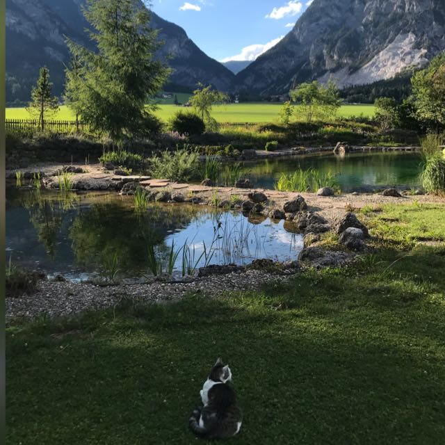 Hier noch ein wunderbares Foto von meiner Nachbarin Pia, die ihre Katze Kimi ( oder ist es der Kater ) vor ihrem Schwimmteich fotografiert hat. Aber für alle, die mich im Herbst besuchen: ich bin direkt nebendran und unser Blick ist ebenso schön🎥!