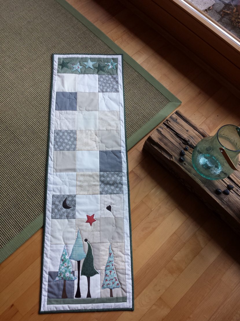Hallo, Ihr Lieben! Mein erster Beitrag aus Österreich: ein kleiner moderner Quilt, der mir schon jetzt Freude macht. Ich hab euch mal die einzelnen Schritte fotografiert, damit ihr seht, dass er schnell gemacht ist. Ein bißchen kniffelig war nur, das Maaß für die Quadrate, die zu Dreiecken geschnitten werden, auszutesten. Denn die sind ja […]