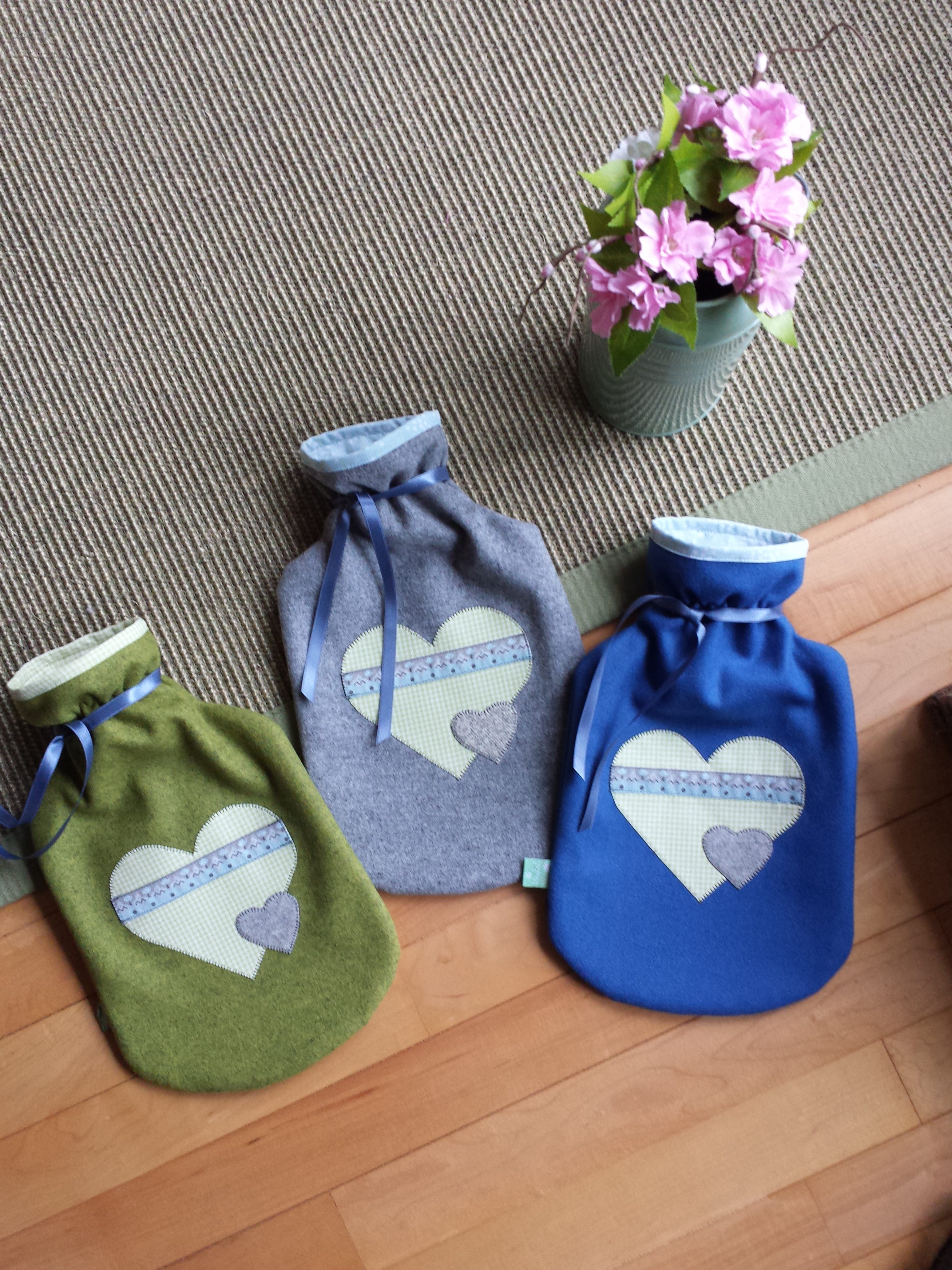 Heute gibt es mal wieder eine nette Kleinigkeit aus meiner Österreich-Kollektion: drei wunderschöne Wärmflaschenhüllen aus echtem Loden mit Applikationen und Quiltstich! Noch ist es ja abends kalt❄❄❄!
